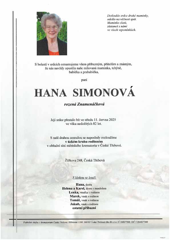 Simonová Hana, rozená Znamenáčková, 82 let,